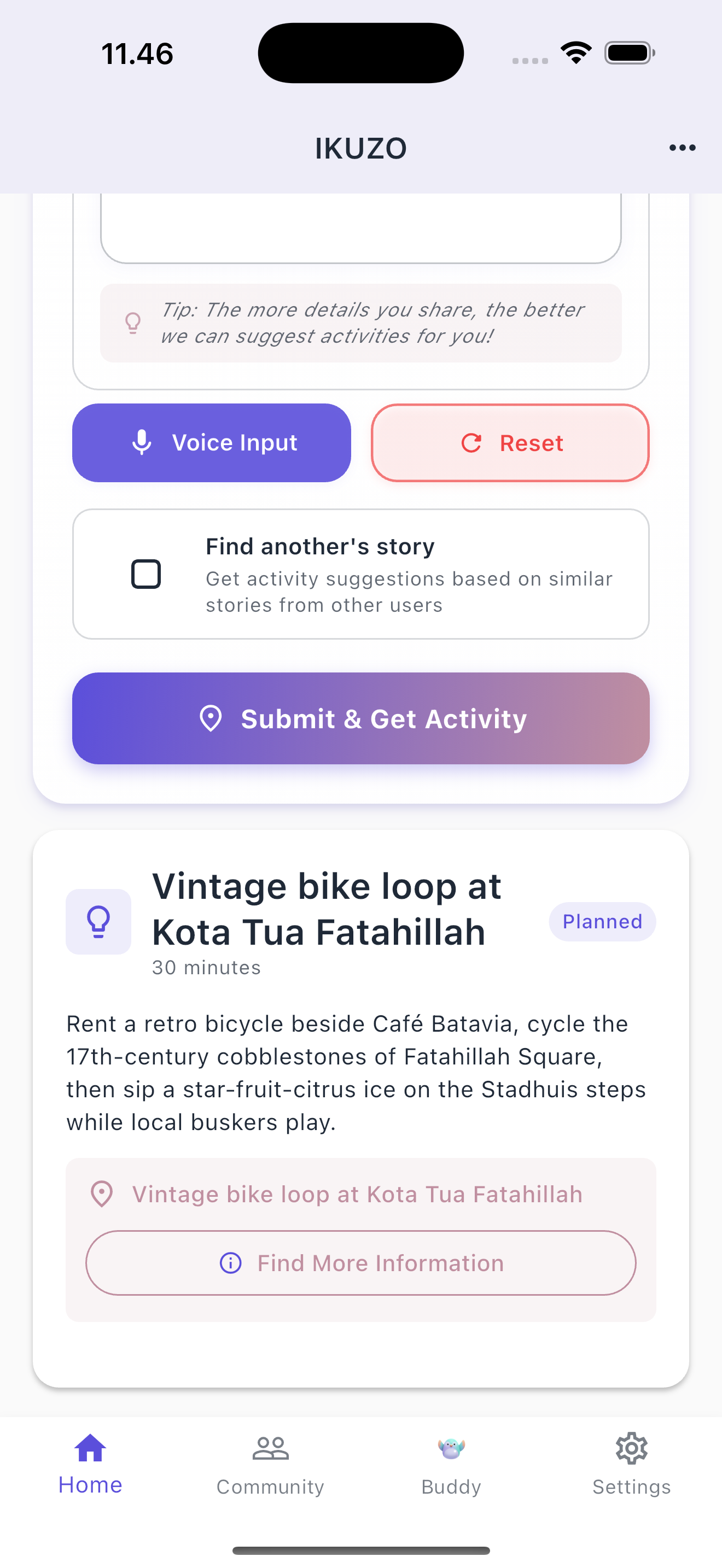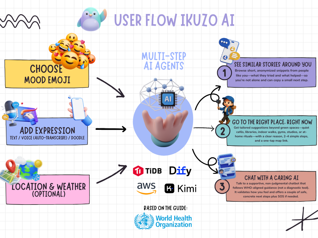 Ikuzo AI converts your daily mood + short story into small, doable suggestions via a multi-step AI agent. Small steps, we're with you.